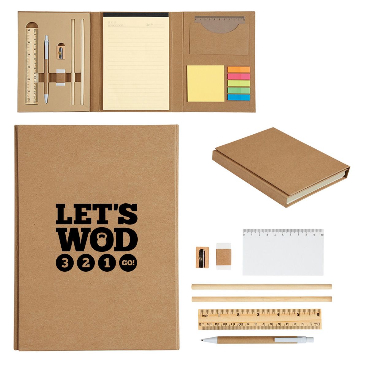 This set includes one 6" wooden ruler, one 4" clear ruler, two unsharpened pencils, one eraser, a wooden pencil sharpener, and a 45-page lined 5" x 8" writing pad. The sticky flags come in five neon colors and Tthe matching pen has a paper barrel. Everyone needs office supplies, add your logo for use and visibility all year long! 6" W x 8 1/4" H x 1" D